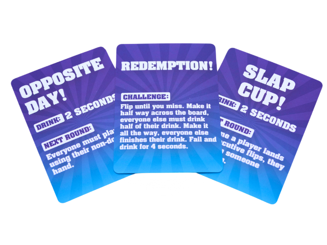 The game is straightforward. Each round, players go head-to-head in a thrilling race to cheers, flip, and push a shot glass to victory, all while navigating hilarious card challenges. It's flip cup, but even better.